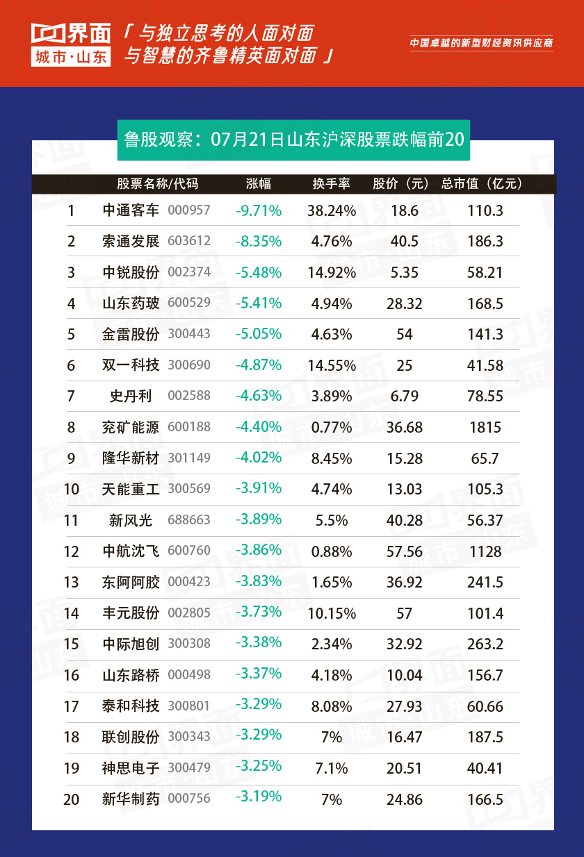 烟台市跌幅榜首: 中锐股份(002374),跌幅5.48%,股价5.35元,总市值141.3亿元。