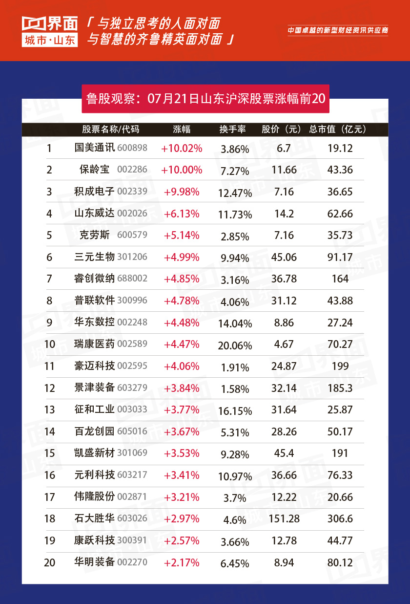 济南市涨幅榜首:国美通讯(600898),涨幅10.02%,股价6.7元,总市值19.12亿元;