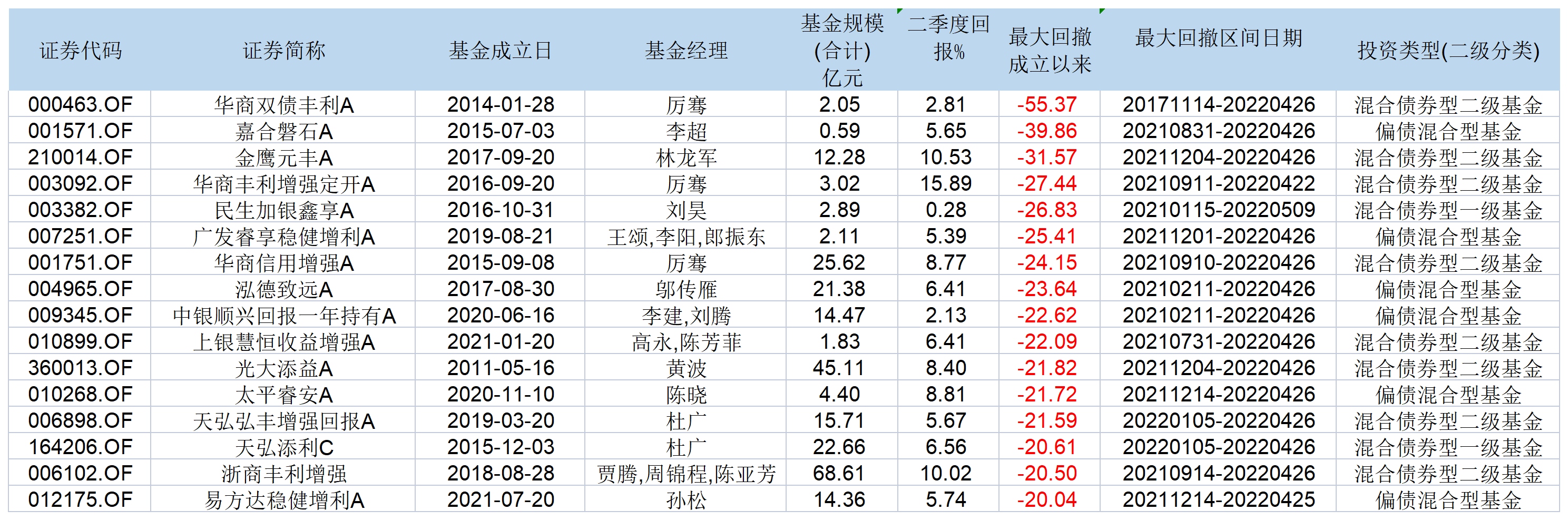 其中,以55.37%的回撤位居第一的是华商双债丰利。该基金成立于2014年1月28日,截至6月30日,规模仅有2.05亿元。虽然二季度的回报率为2.81%,但自2017年11月14日以来至今年4月26日,该基金的最大回撤幅度为55.37%。
