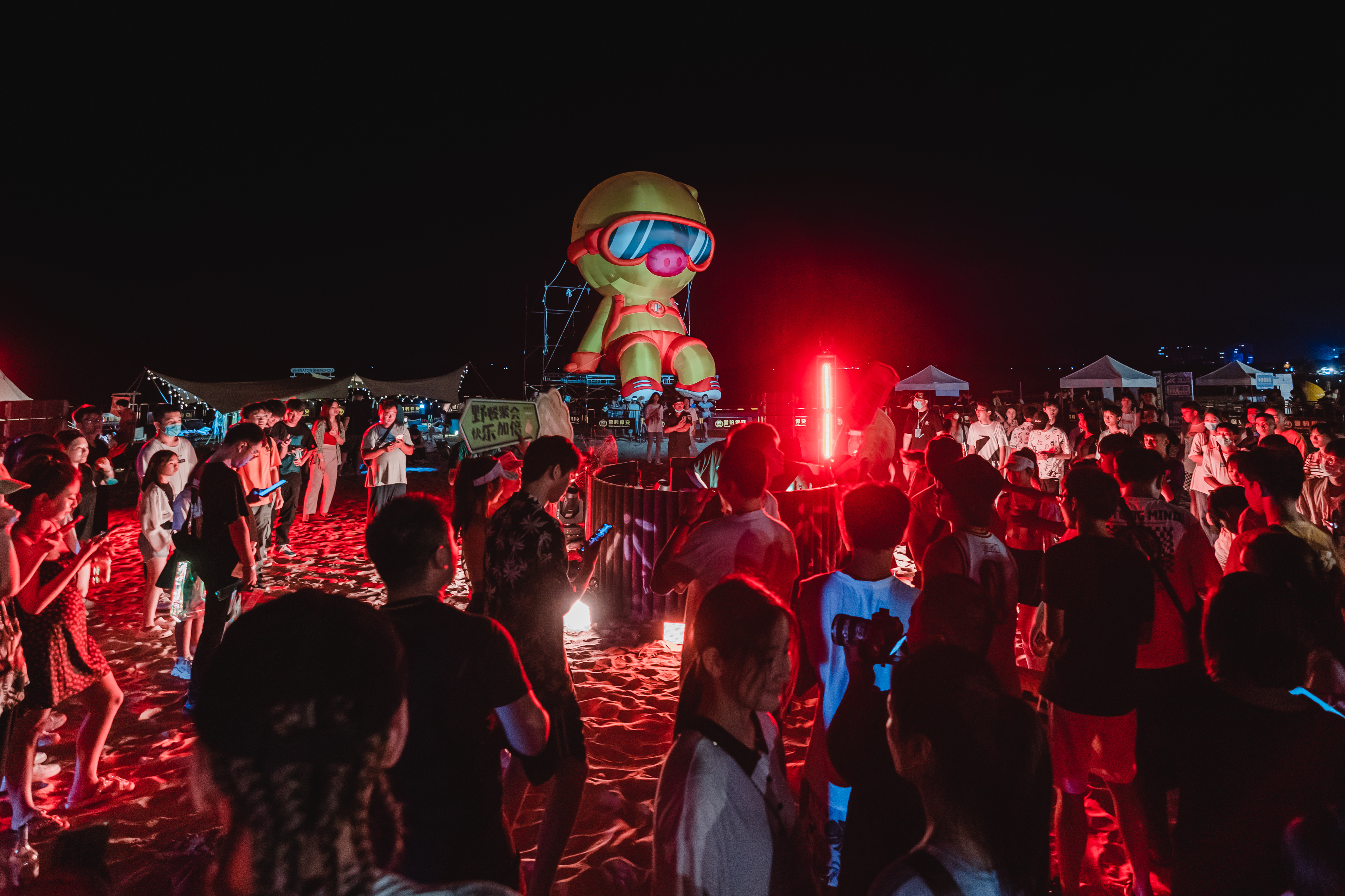 7月9日,在万宁海边音乐节上,大量穿着清凉的游客在这片海滨沙滩尽情唱跳,音浪和海浪声交汇消失在海天之际。