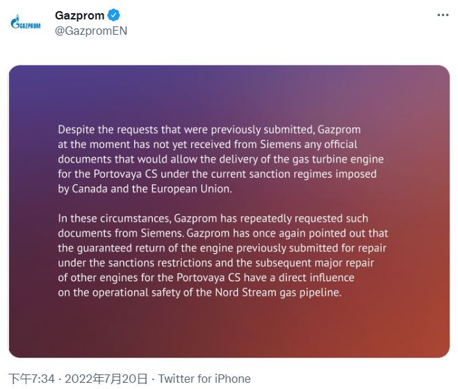 但周三,俄罗斯天然气工业股份公司在Twitter发文称公司没有收到西门子提供的任何官方文件。在加拿大和欧盟对俄制裁背景下,只有提供官方文件才能将涡轮机运至俄罗斯。