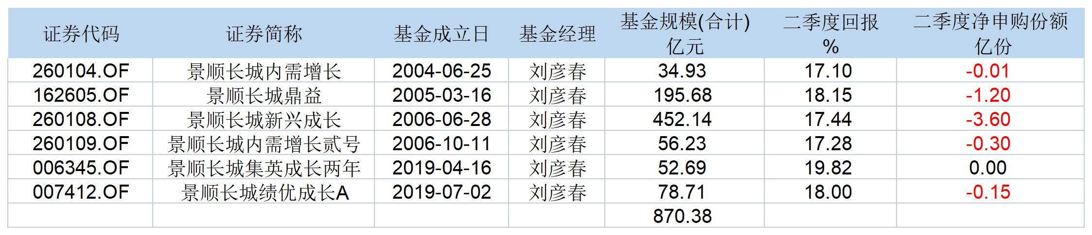 刘彦春的代表作景顺长城新兴成长在二季度末规模达到了452.14亿元,景顺长城鼎益规模为195.68亿元。