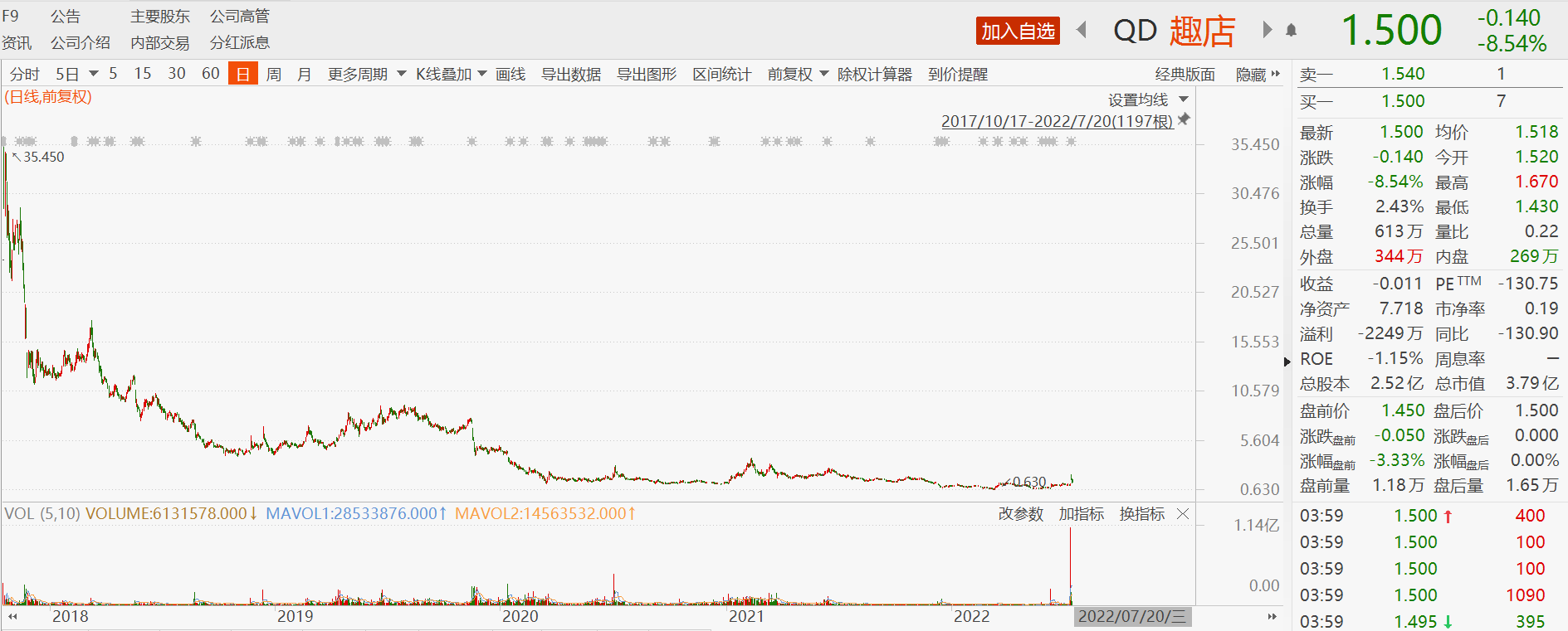 这场直播带货提振了趣店的股价。7月18日,趣店盘中股价一度上涨超过8%,收涨40.3%,市值拉升1.22亿美元,折合人民币超过8亿元。