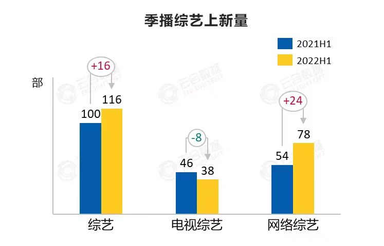 据云合数据发布的《2022H1综艺网播表现及用户分析报告》,2022上半年上新国产季播综艺共116部,同比增加16部。