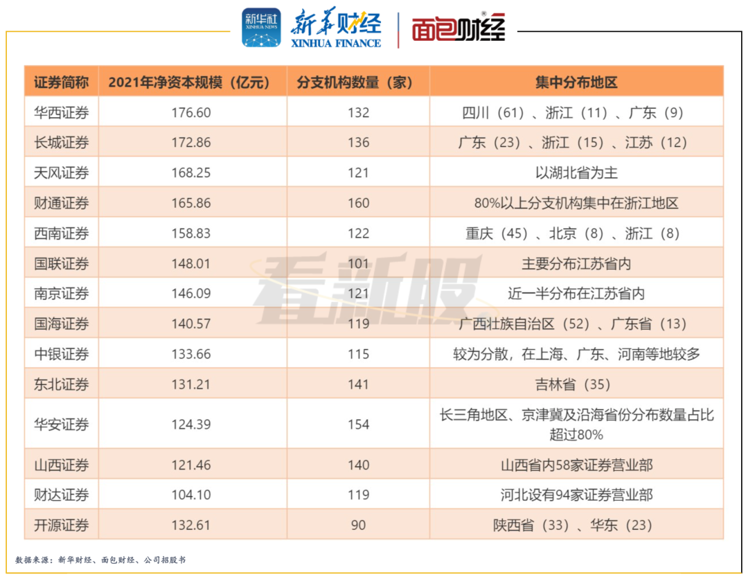 图1:净资本介于100亿元至200亿元之间的上市券商分支机构情况