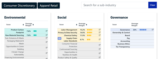 翻译一下表格信息。服装零售行业的重要ESG议题包括:产品碳足迹、负责任采购、劳工管理、隐私与数据安全、化学品安全、供应链劳工待遇(外加在所有行业都是重要议题的公司治理)。