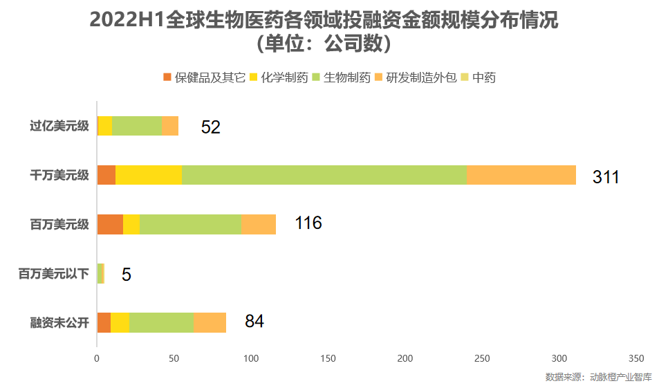 从子行业来看,生物药在各量级的分布中均是主力领域,研发制造外包次之,且在千万美元级中吸金优势明显。