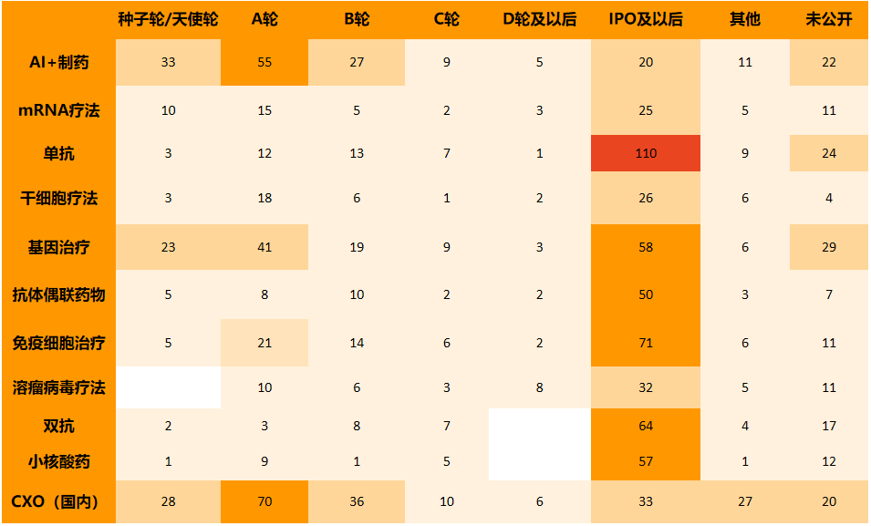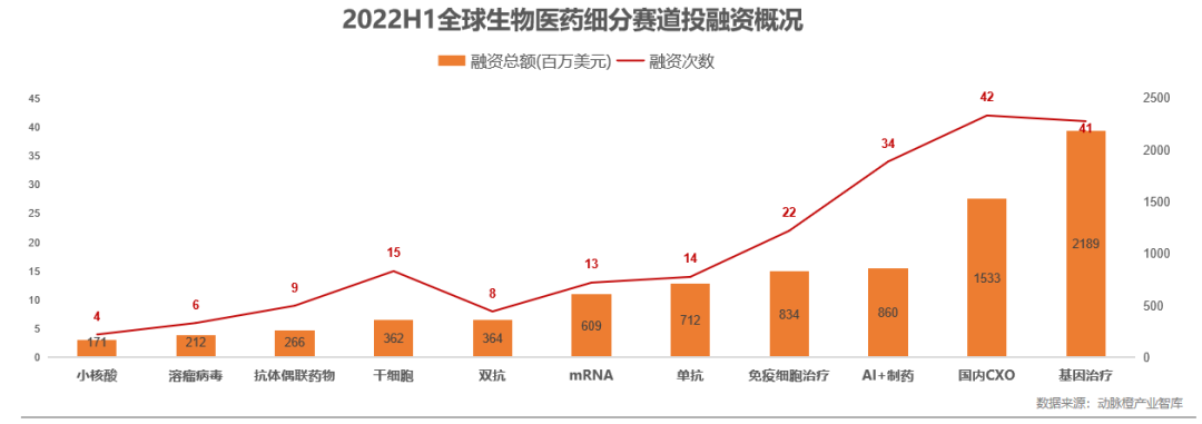 基因治疗和CXO(国内)两个赛道最受资本青睐,AI+制药、免疫细胞治疗、单抗和mRNA四个赛道热度处于第二梯队,上述六个赛道构成了投融资增长的主要动力来源。