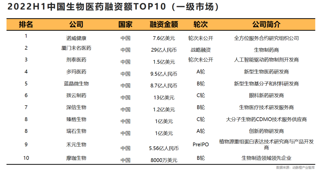 四、诺威健康和厦门未名医药两家企业凭借战略性发展融资入榜全球融资金额TOP10,CXO与合成生物学是国内TOP10企业的显著标签,另有“孵化”属性的新风向;
