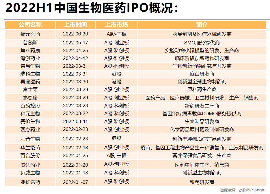 2022年H1国内生物医药企业IPO数量为19家,与去年同期基本持平(20家),上市热情整体未减。