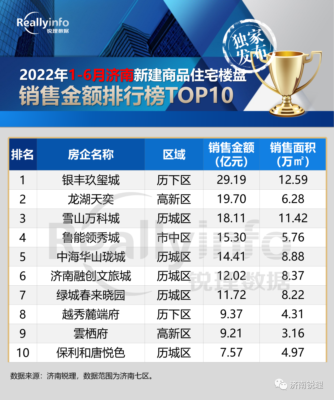 济南方面,据济南锐理发布的济南市2022年1-6月新房房企销售榜单显示,融创中国以上半年36.35亿元/29.73万平的销售业绩荣登季军。