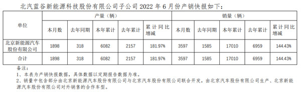 北汽蓝谷披露的2022年6月份产销快报显示,本月销量为3597辆,去年同期仅1585辆,不到今年6月的一半;同时还披露,本年度累计已经售出17010辆,累计同比增长144.43%。