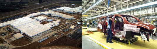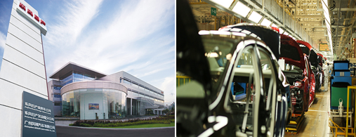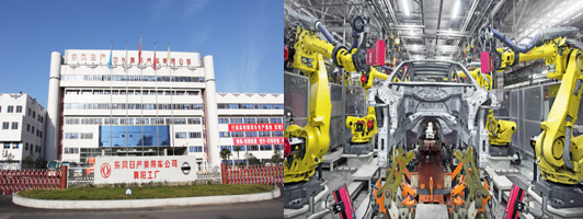 左图 花都工厂大门、右图 整车装配线