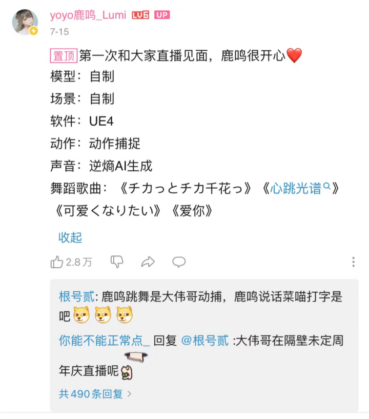 回到最开始对于鹿鸣“中之人”的争议。“声音由逆熵AI生成”,几个拗口的字化解了悬浮在虚拟偶像头上的名为“中之人”的压力。观众不会透过虚拟的鹿鸣探究她背后的“真实”,资本不再担忧虚拟偶像由于“中之人”的独立意识脱离掌控,粉丝大可信任这场虚拟的爱将永不背叛。