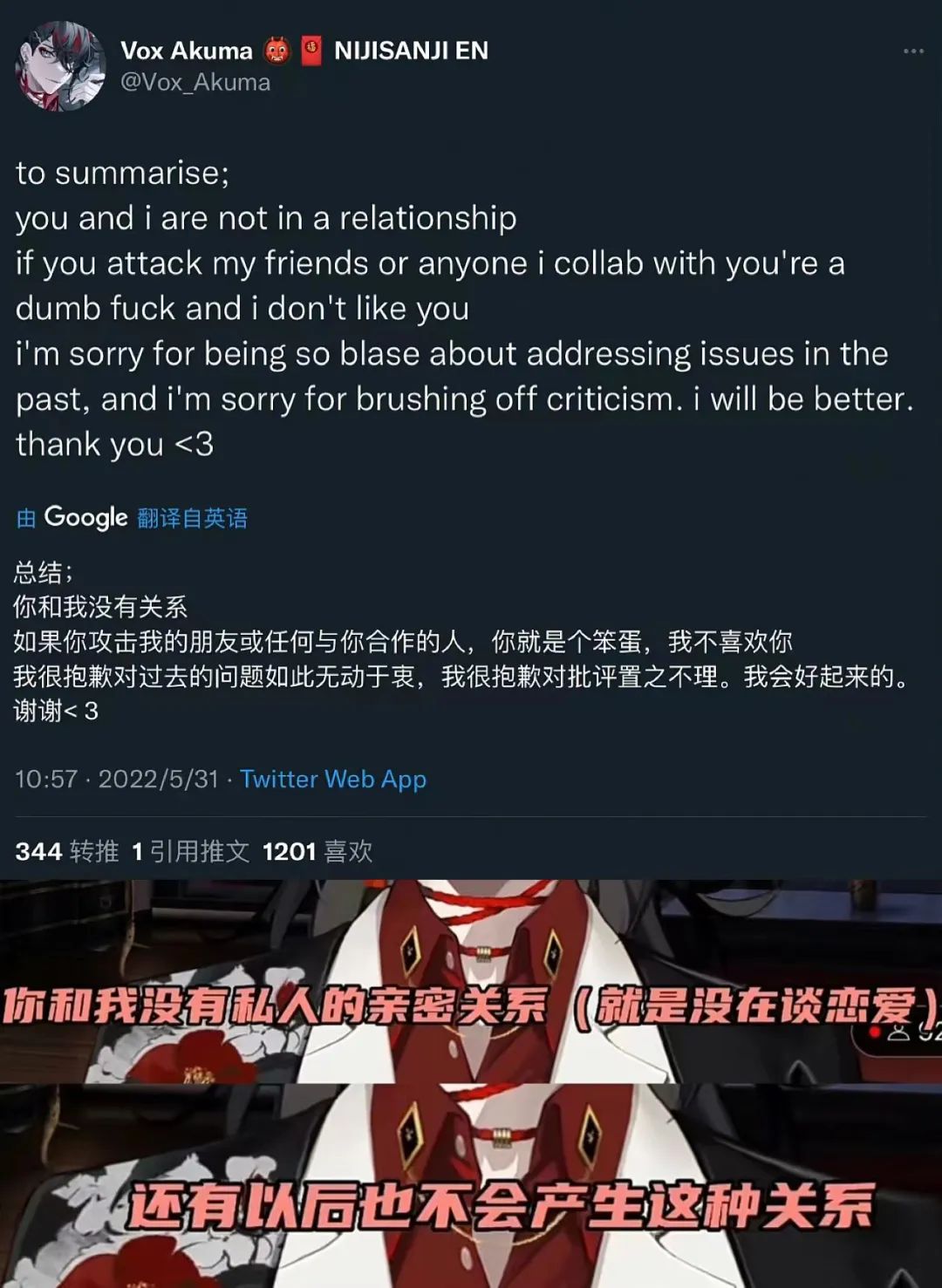 Vox当晚并未在直播中对此突发事件进行回应,而是等到了深夜在Twitter发布了文字回应和直播预告,在直播中,他声明自己以来对粉丝的男友向互动都只是营业需要,“你(所有的粉丝)和我(Vox)都不是亲密关系(relationship)”。