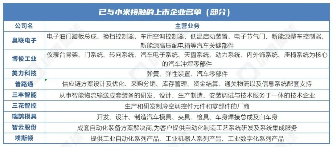 遗憾以上两条传言最终并未落实,不过,小米也实打实的接触了不少A股上市公司,更有企业直言已经入小米汽车供应商体系。