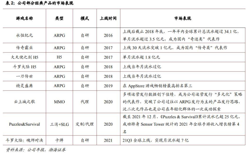 其中,公司经典游戏《狂暴之翼》《少年三国志》及《女神联盟》系列等产品在海外地区多年表现亮眼,牢牢占据ARPG(动作角色扮演游戏)手游、RPG(角色扮演)页游等细分领域的领先地位。其2019年发行的《圣斗士星矢:觉醒》更是先后登顶全球超20个国家和地区的iOS RPG类游戏畅销榜。