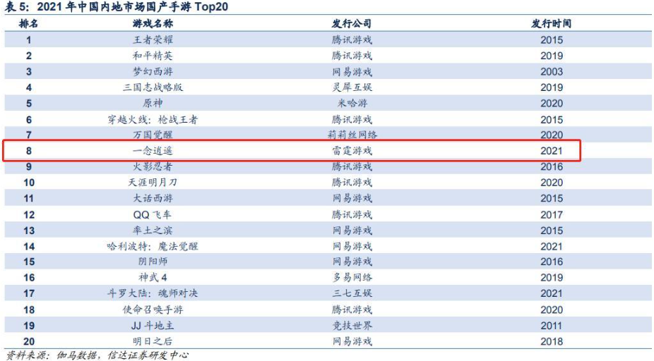 其中,公司初代端游产品《问道》至今已稳定运营十六年,核心玩家仍保持度高认可;《问道手游》产品也已成功运营超6年,且至今仍在游戏畅销榜上排名前30;其2021年上线的自研国风修仙放置类手游《一念逍遥》更是凭借精良的制作成功超越去年网易上线的一众游戏跻身前十。