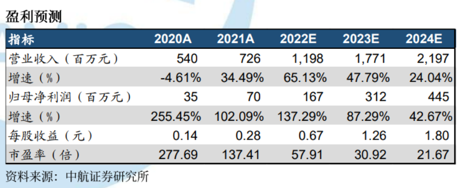 中航证券预计隆达股份2022-2024年实现营业收入分别为12.0亿元、17.7亿元、22.0亿元,同比增长65.1%、47.8%、24.0%;实现归母净利润分别为1.67亿元、3.12亿元、4.45亿元,同比增长137%、87%、43%。同时中航证券也提示了原材料价格抬升风险、产品牌号验证进度不及预期、募投项目及投产进度不及预期、下游需求增长及国产替代进程不及预期等风险。
