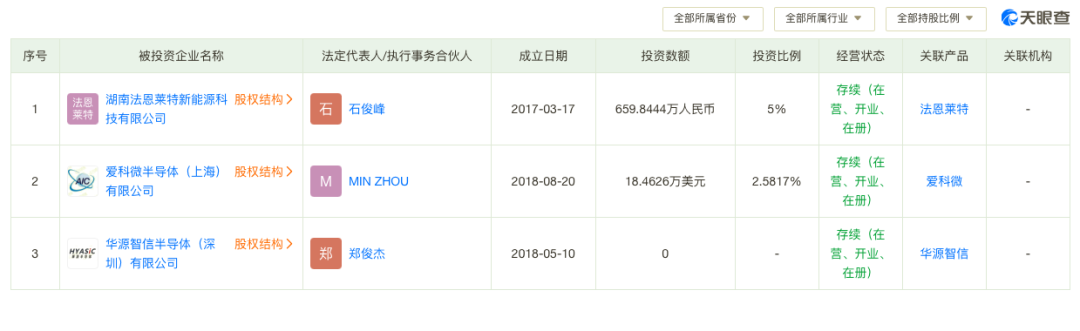 天眼查信息显示,这三家被投企业分别为:湖南法恩莱特新能源科技有限公司(下称:法恩莱特)、爱科微半导体(上海)有限公司(下称:爱科微)、华源智信半导体(深圳)有限公司(下称:华源智信)。