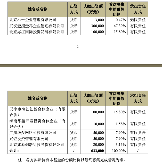 小米新基金的主体公司为北京小米智造股权投资基金合伙企业(有限合伙)(下称:小米智造),计划募集总规模为100亿元,其中首次募资63.3亿元。