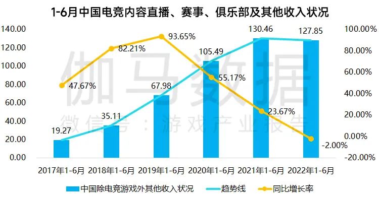 电竞内容直播、赛事、俱乐部和其他收入共127.85亿元,同比下降2.00%