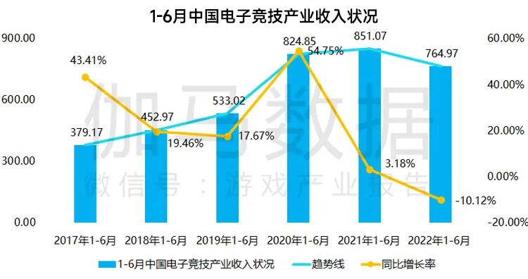 1-6月电竞产业收入为764.97亿元,同比下降10.12%