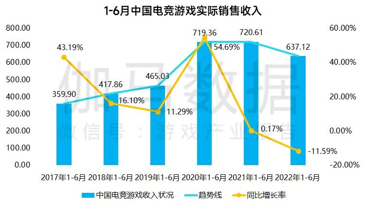 中国电子竞技游戏收入为637.12亿元,同比下降11.59%。上半年电竞热度降低,用户收入和付费意愿的变化导致电子竞技游戏收入大幅下降。