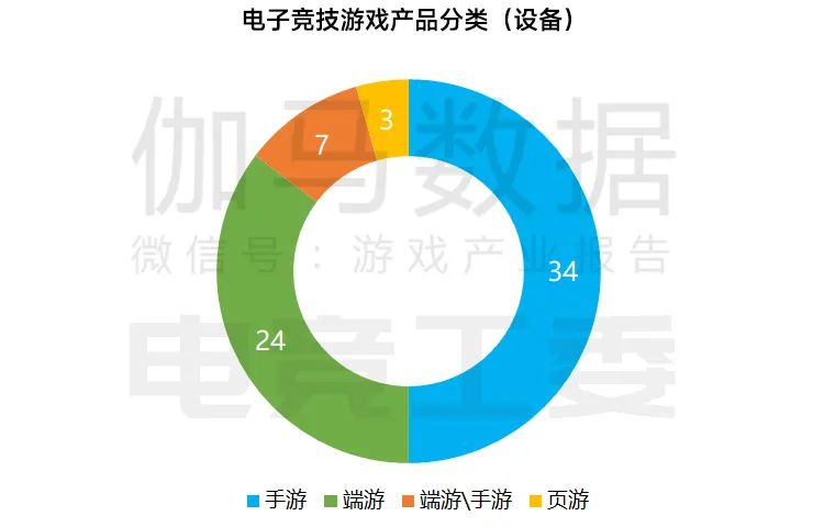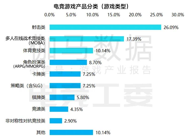 经统计,2022年上半年市面上全部的电竞游戏中,有24款为端游,34款为手游,7款产品为多端游戏,另有3款电竞游戏产品是网页游戏。其中射击类数量最多,占比达到26.09%;多人在线战术竞技类(MOBA)游戏的数量仅次于射击类,占比达到17.39%;体育竞技类游戏产品的数量占比达到10.14%。