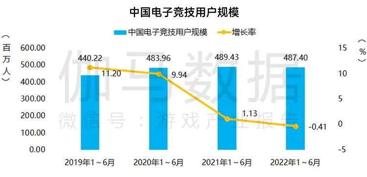 2022年1-6月,中国电子竞技用户规模约为4.87亿人,同比略有下降。此趋势与游戏产业用户规模的变化相符。