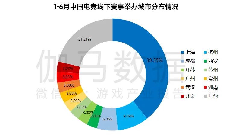 电子竞技赛事的举办城市以一线城市和新一线城市为主。上海是历年全国承办赛事数量最多的城市,今年上半年有39.39%的电竞赛事在上海举办,主要集中在1-3月。位于长三角地区的杭州和苏州排名也相对靠前。