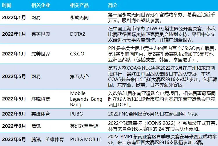 2022年1-6月,中国电子竞技产业持续推动出海进程,在东南亚等地区的电子竞技赛事取得一定效果,实现以电子竞技作为呈现方式传播中国文化的目的。