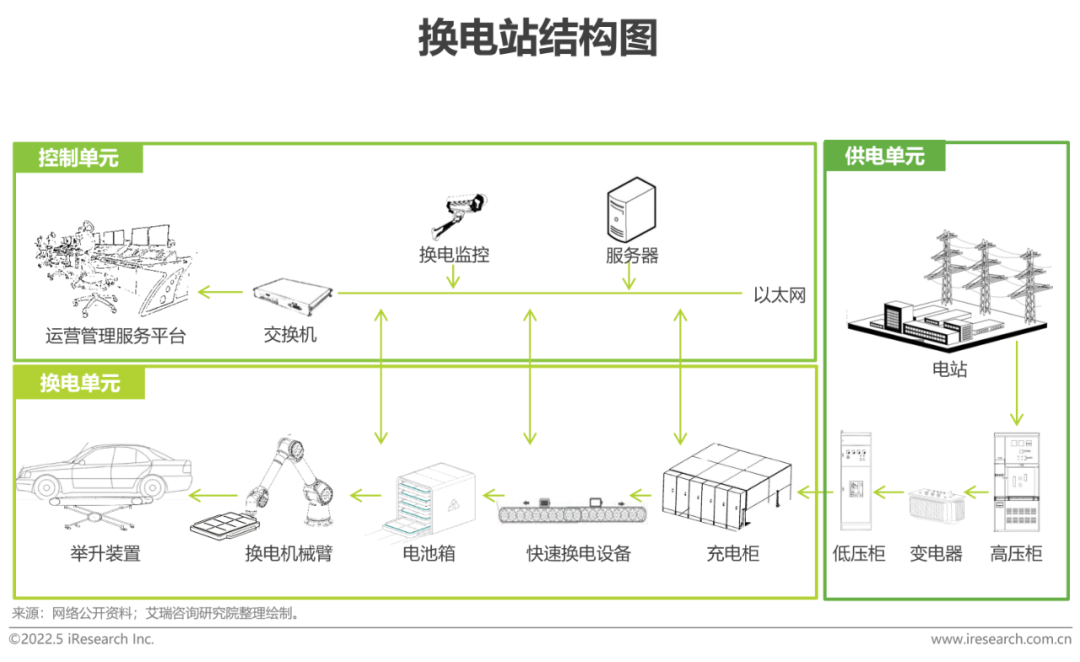 换电站主要包含定位系统、换电系统、运维系统、安全系统和物流系统。其中换电系统是换电站的核心,由换电平台、码垛机、升降机构、锁止机构、连接器等组成;控制系统包括:充换电云平台系统、智能站控系统、配电监控系统、烟雾/安保监控系统等;供电系统:高压电柜、变压器、低压电柜等。