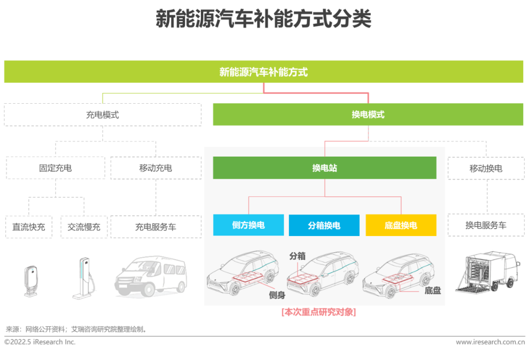 新能源汽车补能方式分为两种,即充电模式和换电模式,其中换电模式按其换电地理位置可分为固定换电(换电站)和移动换电(换电服务车),按换电方式可分为底盘换电、侧方换电、分箱换电,目前底盘换电为市场主流换电模式。