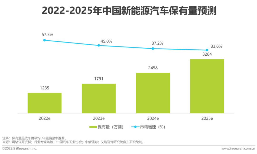 基于2021年中国中国新能源汽车市场的表现,未来市场预测要高于之前的预期,2022年,受疫情、芯片短缺、地缘政治等因素影响,预计增速将有所放缓,但仍处于高位,预计2022年中国新能源车销量突破500万辆,到2025年中国新能源汽车销量将突破1千万辆,保有量将突破3千万辆,其销量占比将超30%,高于2020年国务院颁布《新能源汽车产业发展规划(2021-2035年)》提到的新能源汽车销量占比20%的目标。