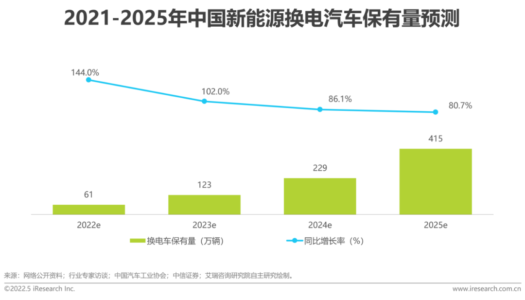 未来,中国新能源汽车销量有望在2025年突破1000万辆,相应随着换电技术、商业模式不断成熟,政策支持力度加大、相关企业积极规划布局,中国新能源换电汽车市场将呈现高速增长态势,预计到2025年其销量将达192万辆,CAGR约86%,占新能源汽车总销量近19%,其保有量将达415万辆,CAGR约102%,占新能源汽车总保有量近13%。