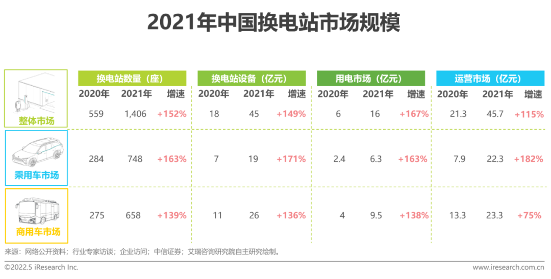 2021年,中国运营市场规模达45.7亿元,同比增长近1.2倍,其中乘用车换电站运营市场规模约22.3亿元,同比增长1.8倍,商用车换电站运营市场规模约23.3亿元,同比增长75%。