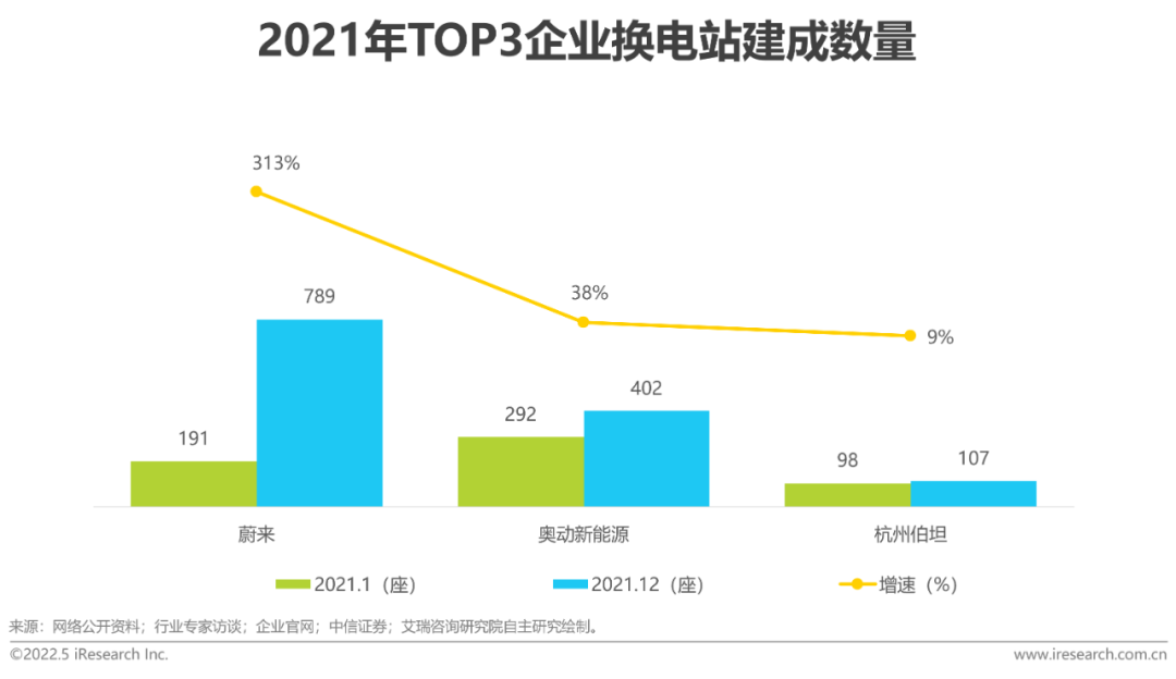 2021年蔚来换电站建设速度最快、规模最大,占比超50%