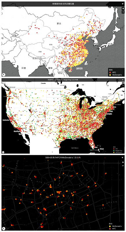 (从上至下依次为:KFC和麦当劳在中国的开店情况、在美国的开店情况、在上海的门店分布情况。数据来自GeoHey)