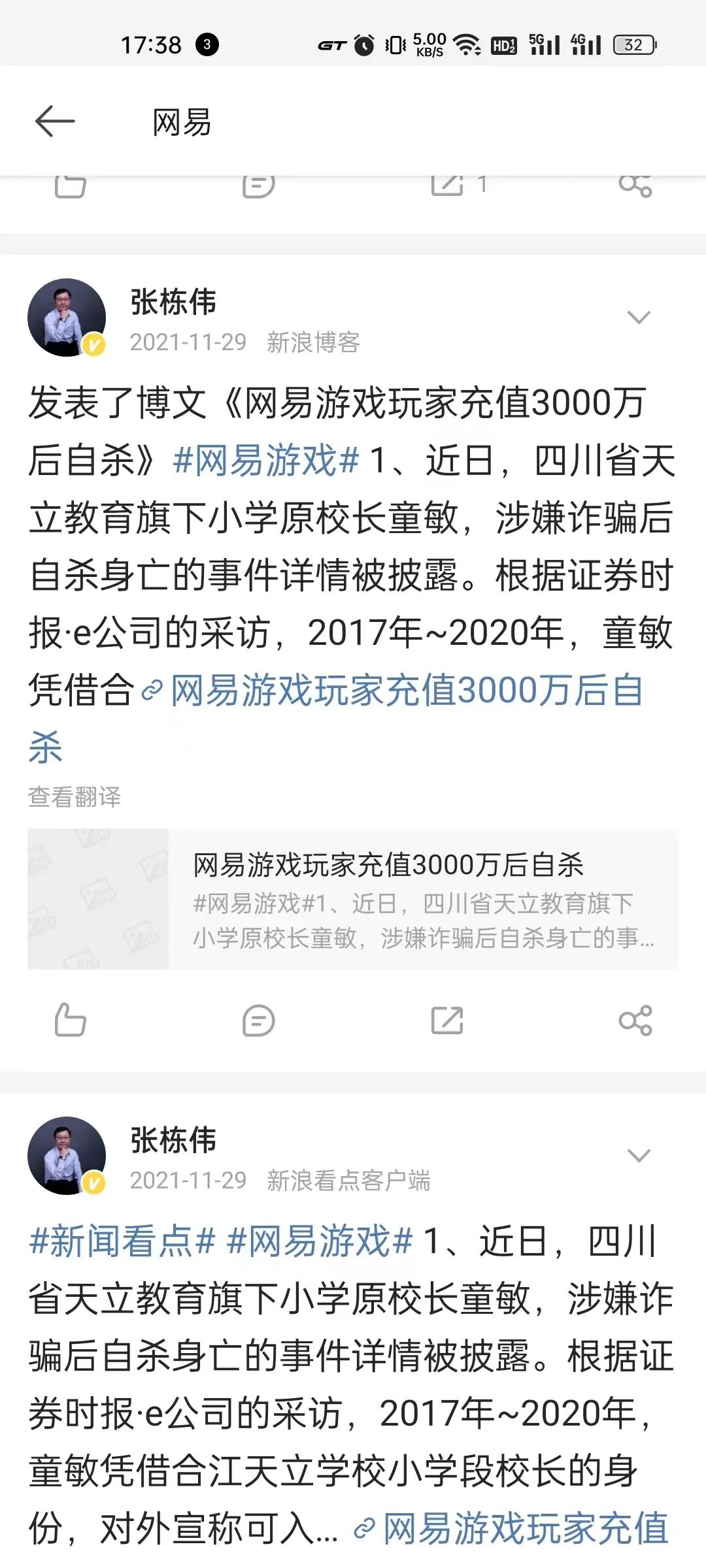 在张栋伟微博搜索“网易”可发现:2020年10月,网易被约谈处罚,张栋伟发微博称不希望网易号被关停,自己在网易号有多篇“10万+”;去年11月,张栋伟发文《网易游戏玩家充值3000万后自杀》,并在结尾指责网易“充值无上限,赚钱无底线”;在收到起诉书前不久的5月31日,张栋伟也曾发微博评论“网易游戏不氪基本没法玩”。
