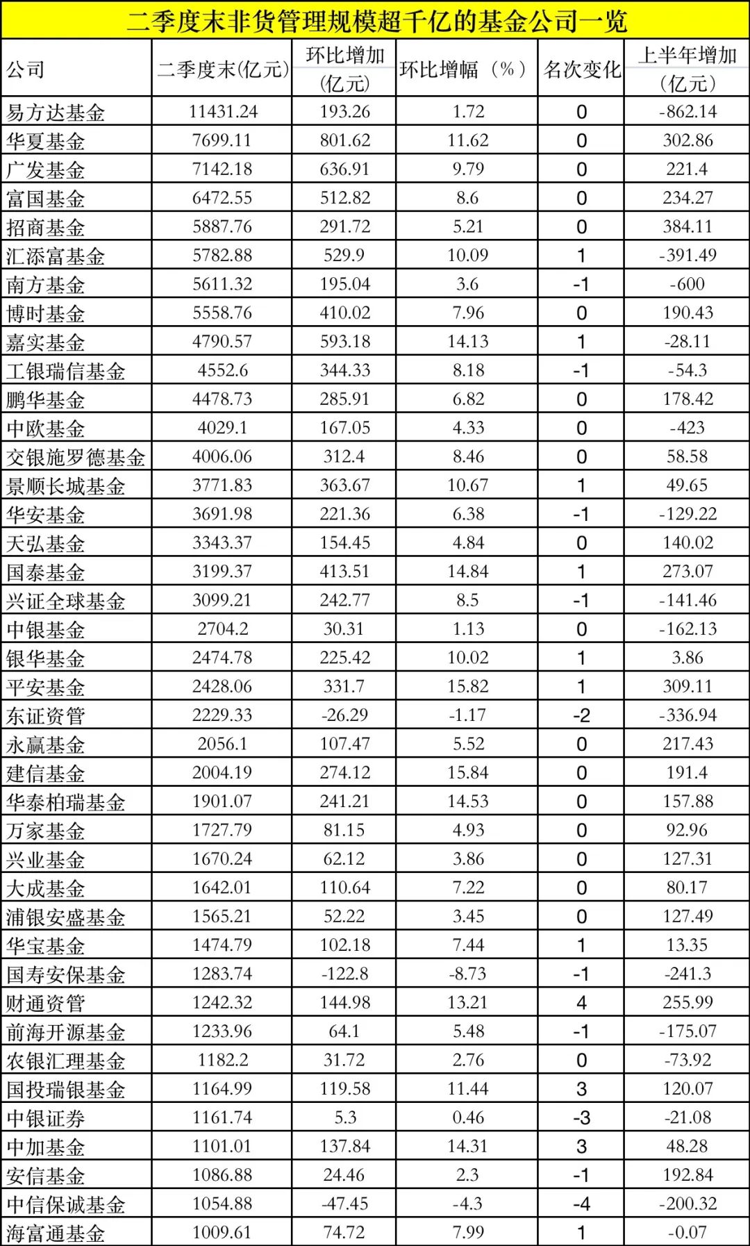 其中,有40家公募二季度末非货管理规模超千亿元,数量较一季度末增加1家,新进入者为海富通基金。 易方达基金非货基管理规模11431亿,继续蝉联第一名。