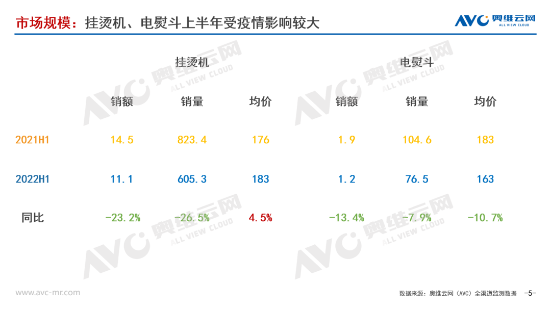 随着疫情再次反复,各地政策再次收紧,上半年熨烫市场依然没能走出阴霾,延续2020年以来的下滑趋势且有愈演愈烈之势,奥维云网(AVC)全渠道推总数据显示,2022H1挂烫机零售额11.1亿元,同比-23%,零售量605.3万台,同比-26.3%,2022H1电熨斗零售额1.2亿元同比-13.4%,零售量76.5万台,同比-10.7%。