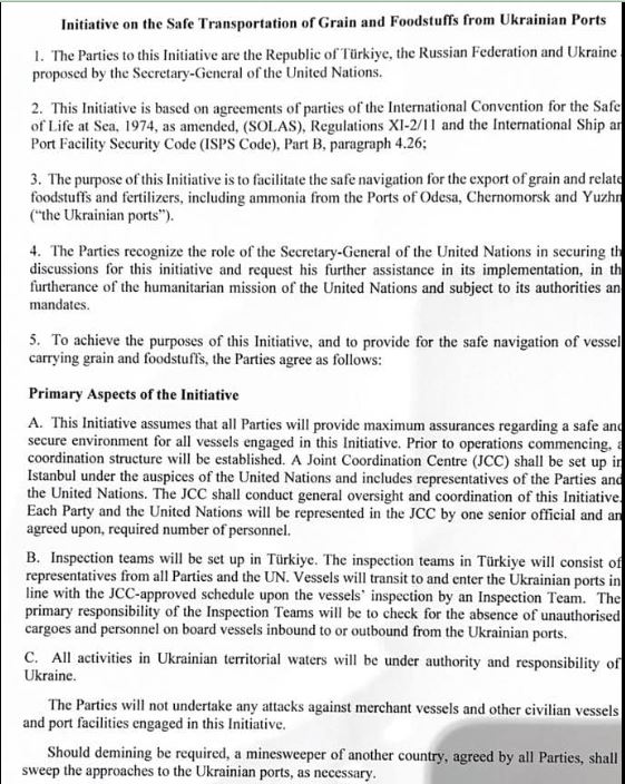 对于乌克兰的担忧,协议规定所有在乌克兰领海的活动都由乌克兰负责。乌克兰领航船将带领货船避开水雷进入港口。商船和民用船只在黑海通道行驶时,俄乌双方都不能对船只发起进攻。