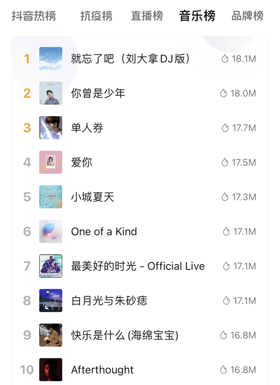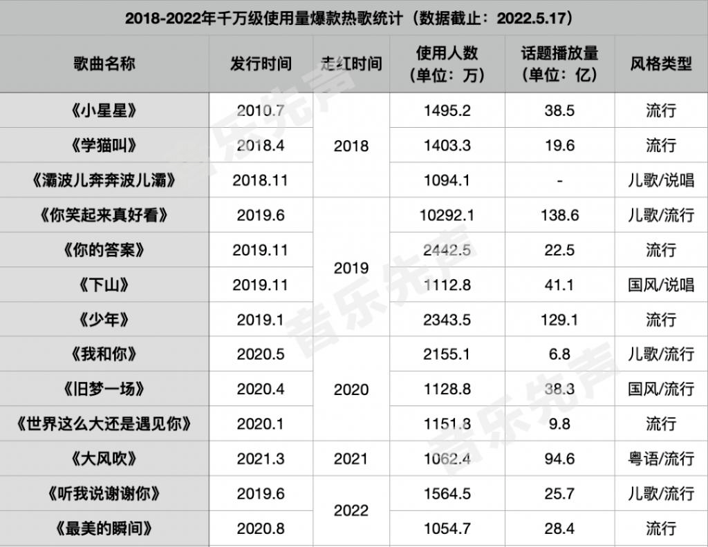 据统计,从2018年-2022年,抖音上共有13首歌曲使用达到了千万次以上,其中包括《学猫叫》《你笑起来真好看》《你的答案》《大风吹》《听我说谢谢你》等等。