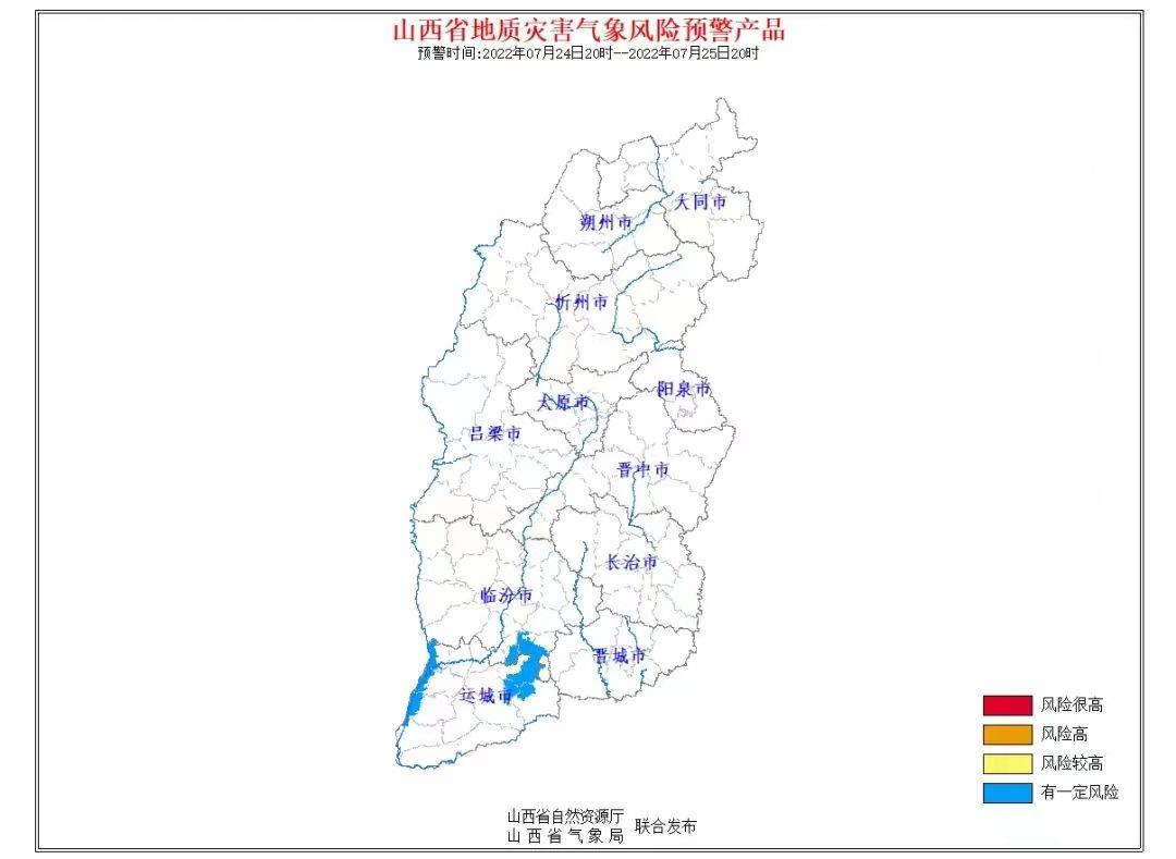 据央视新闻,山西省自然资源厅、省气象局联合发布2022年07月24日20时至25日20时地质灾害预警:
