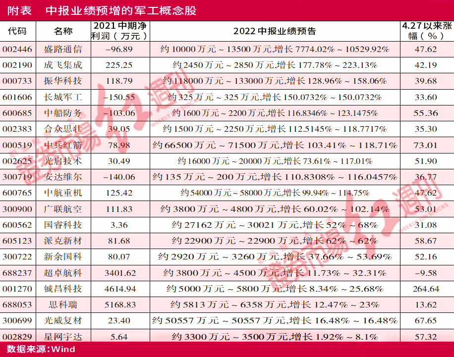 就目前来看,在申万国防军工板块125只概念公司中,已有38家公司提前发布了中期业绩预告,结合预告类型统计,预喜、预忧各占半数。其中,航天军工概念公司盛路通信的预增幅度最高,原因是通信行业整体发展趋势向好,订单逐步交付,公司规模效应凸显,盈利能力提升,报告期内净利润预计完成1亿元~1.35亿元,同比增长7774.02% ~ 10529.92%。此外,成飞集成、振华科技、长城军工、中船防务、合众思壮等10家公司也均预期中期盈利情况较好,报告期净利润均预计将同比实现翻倍增长。