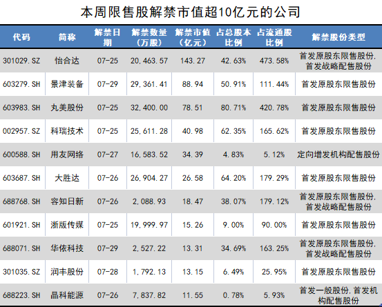 解禁数量超过1亿股的公司有8家,分别为丸美股份(603983.SH)、景津装备(603279.SH)、大胜达(603687.SH)、科瑞技术(002957.SZ)、怡合达、浙版传媒(601921.SH)、用友网络(600588.SH)、利柏特(605167.SH)。