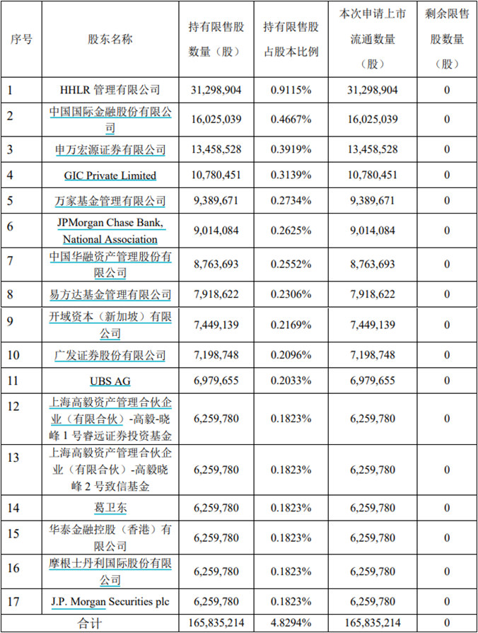 “踩雷”的股东共17位,不乏大量明星资本。包括券商中金公司、申万宏源、广发证券等,基金公司易方达基金、万家基金等,外资GIC Private Limited(新加坡政府投资有限公司)、摩根大通银行、UBS AG(瑞银)、摩根士丹利等,还有高瓴旗下的HHLR管理有限公司、高毅资产,资本大佬葛卫东个人也有625.98万股。