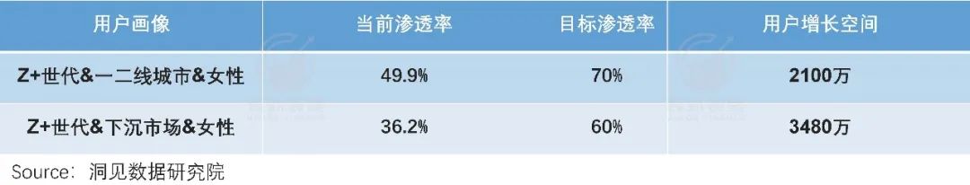 在上文的测算中,这一点也有验证:最接近高收入、高线城市年轻女性的年轻男性,渗透率最高(20%),并且正处于奇点时刻,接下来渗透率将会快速提升。