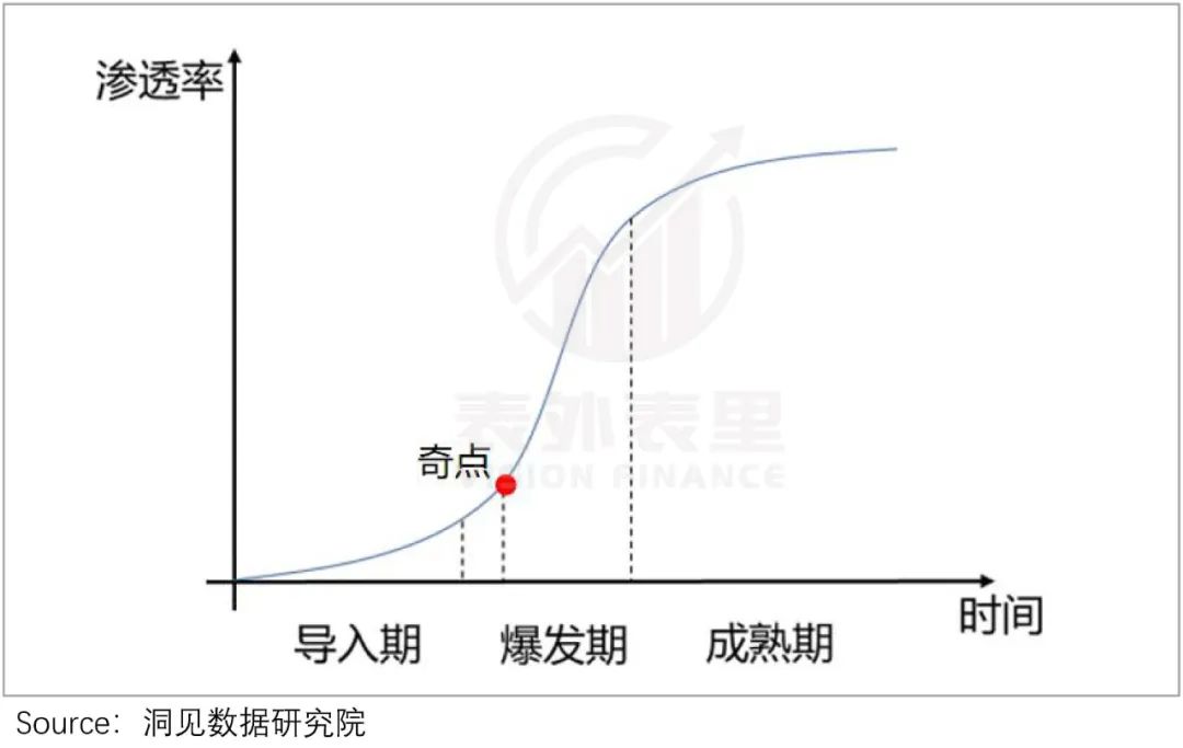 备注:奇点时刻,是指产品介于导入期和爆发期之间渗透率速度快速增加的阶段。根据产品性质的不同,奇点时刻对应的渗透率也不相同,范围大概为10%-20%。